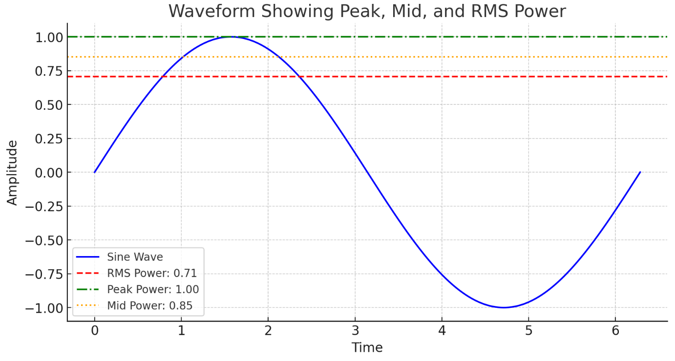 Above is a chart of a sine wave showing the different power levels: Peak, Mid, and RMS. The sine wave is plotted over time, and the different power levels are marked with lines: